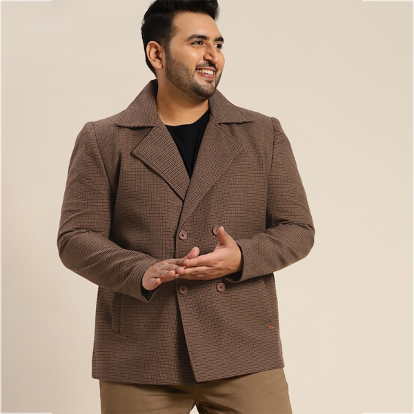 Men Plus Size Brown Checked Double-Breasted Overcoat