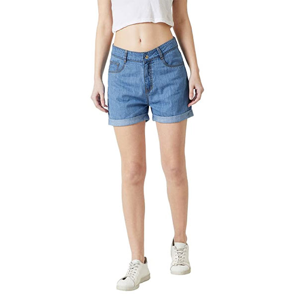 Blue regular fit regular length mid rise denim shorts, has five pockets and button zip closure, has a clean look.