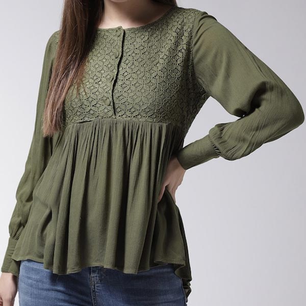 • Olive green self-design woven empire top, has a round neck, long sleeves, button closure