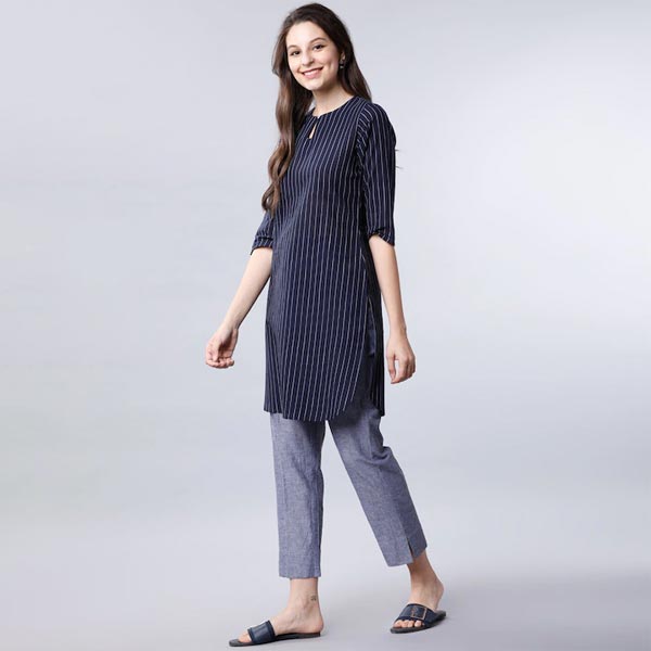 • "Navy Blue and White striped Tunic, has a round neck, three-quarter sleeves, and button closure
