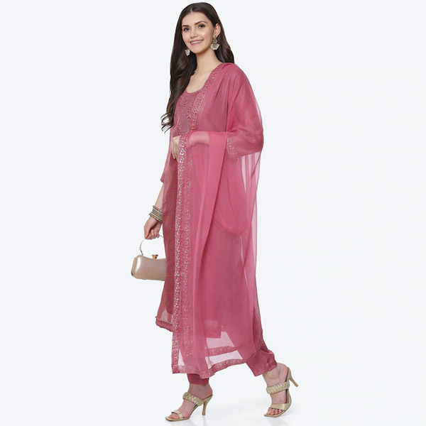 • Pink and silver-toned unstitched dress material